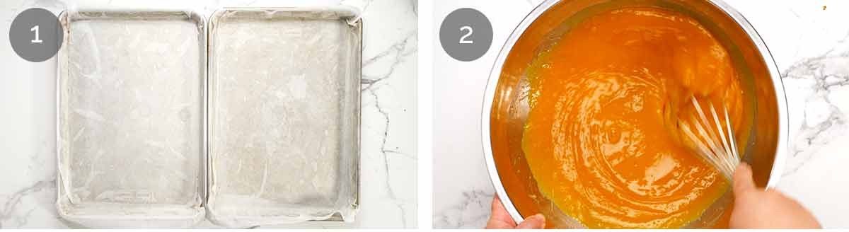 - Preheat oven to 180°C/350°F (160°C fan-forced). Lightly oil spray or butter grease two 38 × 25 cm / 10 x 15" baking trays that are 2.5 cm / 1" deep (jelly roll pans). Line with a sheet of baking paper. (Note 6)