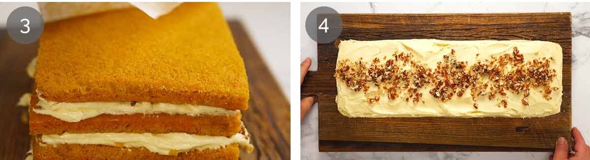 - Frost surface – Spread the top and sides with remaining frosting. Sprinkle the surface with remaining pecan crumble.