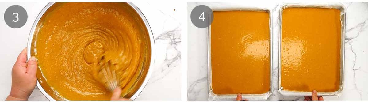 - Batter – In a large bowl, whisk together the pumpkin and Wet ingredients. Add the Dry ingredients and whisk well until combined.