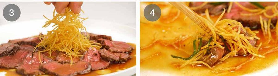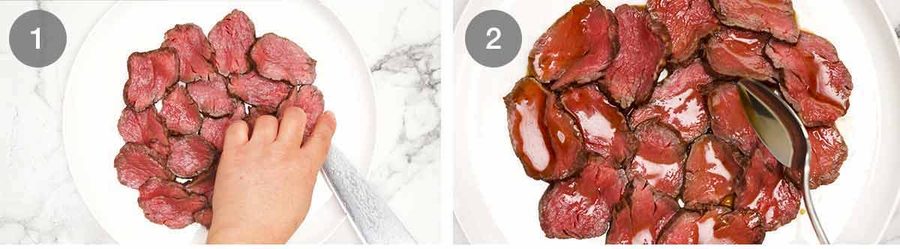 Slice – When you are ready to serve, finely slice the beef. Aim for 3mm / 1/16″ thick slices but up to 5mm / 1/8″ is fine. Don’t fret if you tear or the edges crumble. Once it’s plated up, sauced and garnished, you can’t tell!