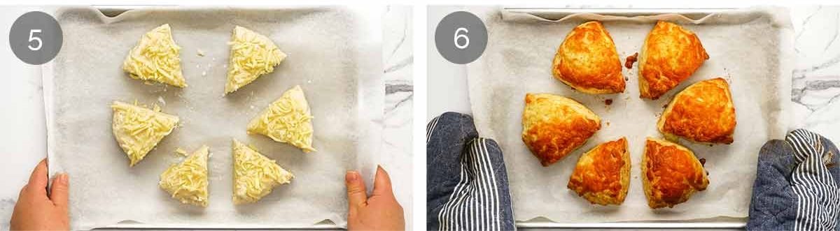 - 6 wedges – Put it on a sheet of baking paper, pat and shape into 3cm / 1.2" thick round disc. Brush with milk (top and sides), sprinkle with cheese, lightly press in. Cut into 6 wedges. (Note 4 for rounds)