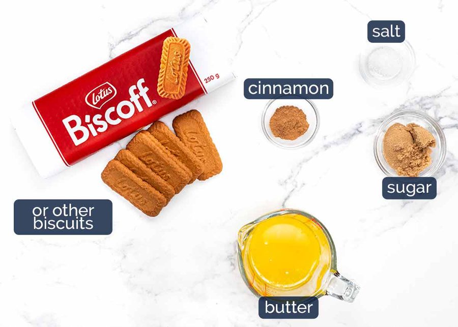 - 300g/10 oz Biscoff (38 pieces) or other plain biscuit/cookies 1 1/2 cups crumbs) (Note 1)