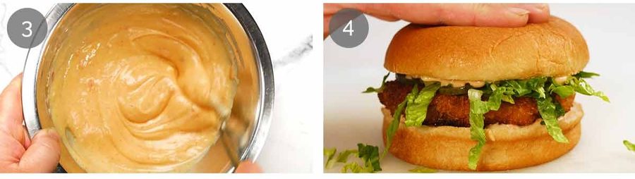- Crumb – Using slightly wet hands, roll mixture into 4 balls. Coat ball in flour, then egg (let the excess drip off), then press down into a patty in the panko. Make it a smidge larger than the size of your bun (it shrinks a wee bit). Flip using a spatula, press down to adhere panko and make sure to coat the sides. Remove with a spatula onto a plate, repeat with remaining balls.