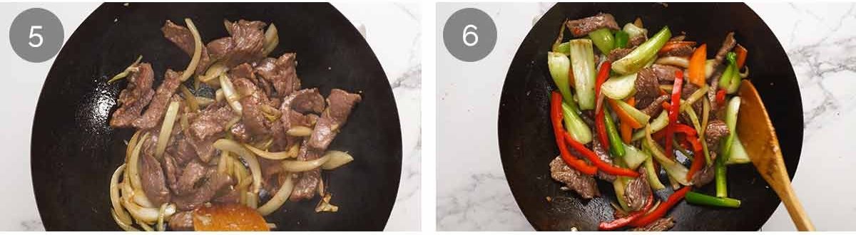 - Tenderise beef 20 minutes, rinse, toss with 1.5 tbsp sauce. Mix in cornflour then water into Sauce. Stir fry in this order: onion + garlic > beef > carrot + capsicum + bok choy stems + green onion stems > sauce > wilt bok choy leaves + green onion. Serve!