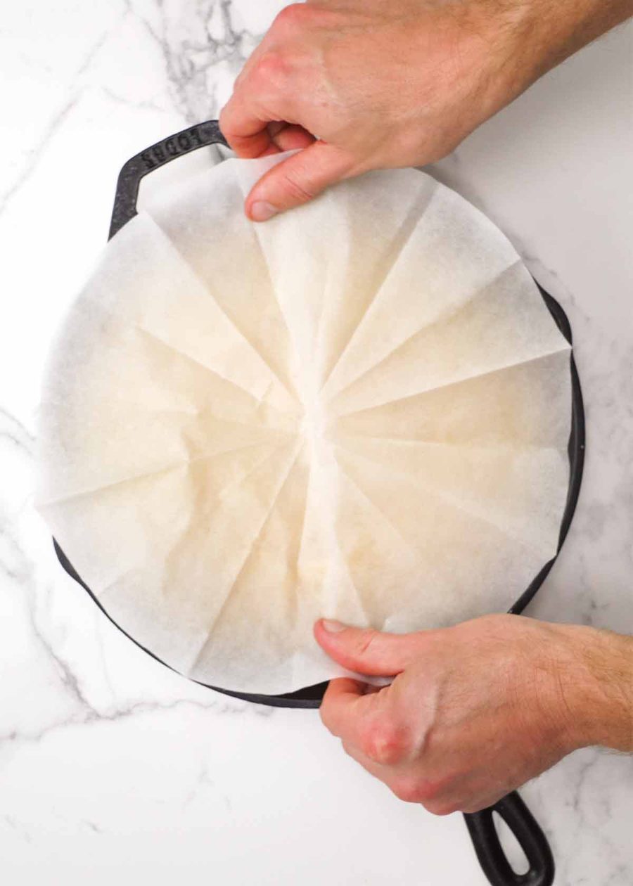 Cut a square piece of baking paper (parchment paper) just big enough to cover your cast-iron pan, pot, or whatever you are covering. Then fold it in half on the diagonal.