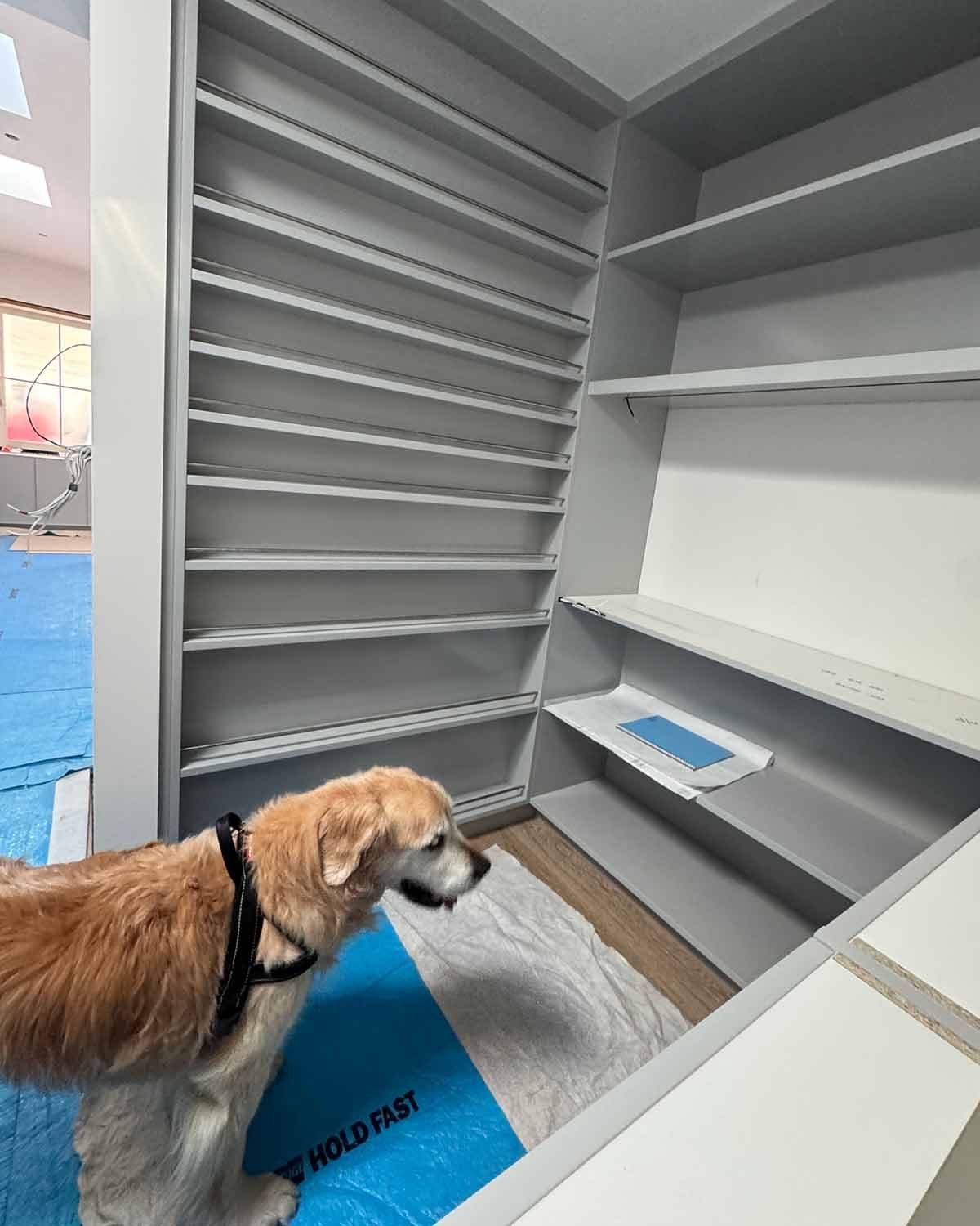 He spent a lot of time stalking around the kitchen, making sure it was being built to his exact snack storage specifications! 😂