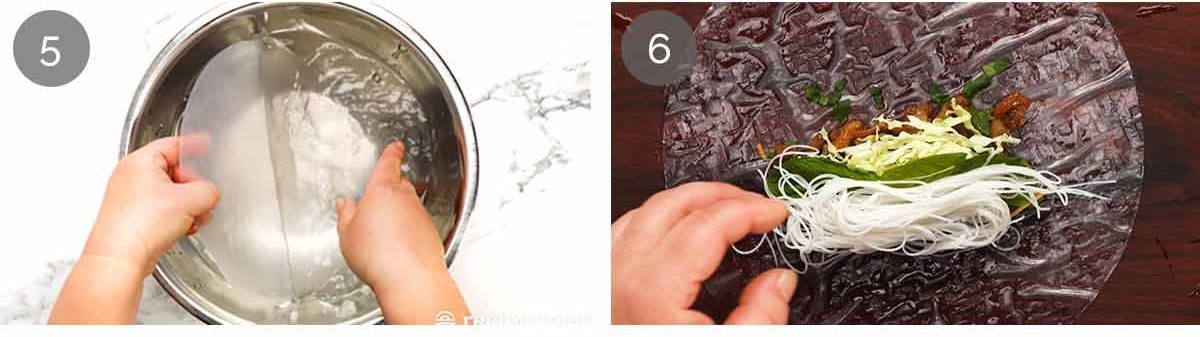 Dip rice paper – Fill a bowl with cold tap water. Then dip the rice paper in for 2 – 3 seconds and transfer onto a cutting board. It will be stiff at first but will soften as you stuff and by the time you start rolling it will be soft enough to roll.