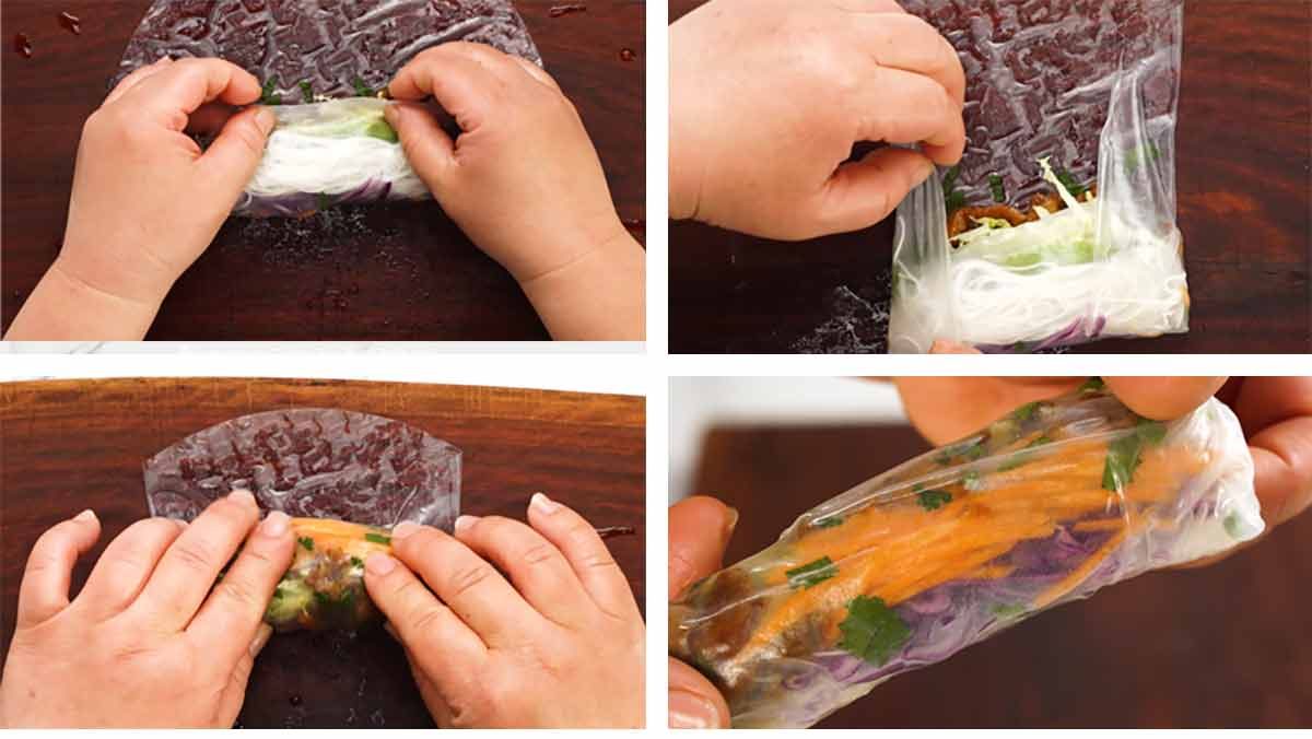 - Roll (Note 5) – Fold the lower part of the rice paper up over the stuffing, then fold the sides in. Roll to enclose the filling, making it fairly firm. It will self-stick to seal (yay!). Don't worry if it's a bit wonky, it will still taste fabulous!