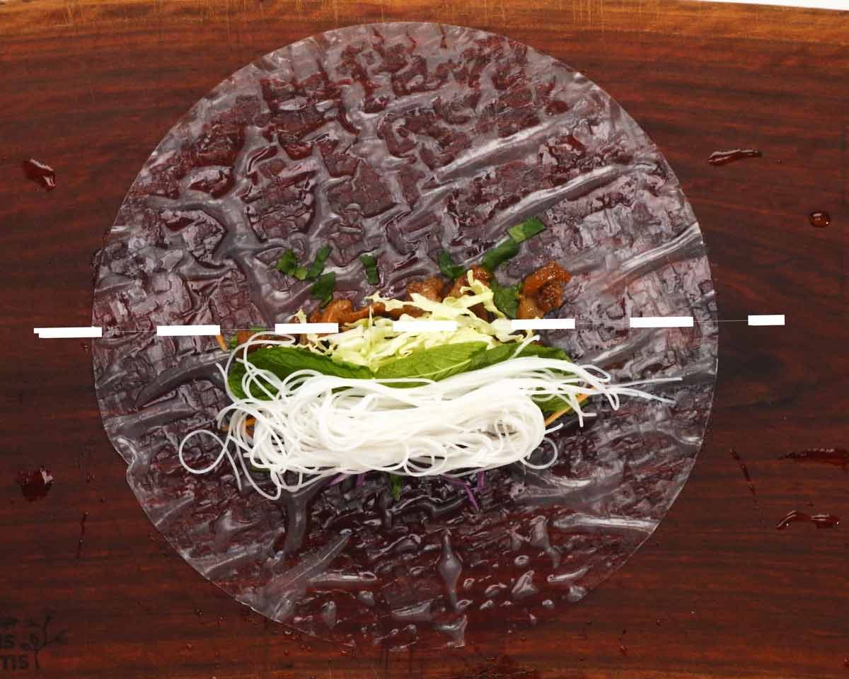 - Stuffing – Place stuffing just beneath the middle, in whatever order you want (it doesn't really matter), but try to pile in a symmetrical stack (for ease of rolling / neat rolls). My typical: sprinkle ~2 tsp coriander, top with one-tenth of the chicken, then carrots, cabbages, mint leaves (generous), and noodles last to weigh everything down (I wrap around hand to bundle into a neat shape).