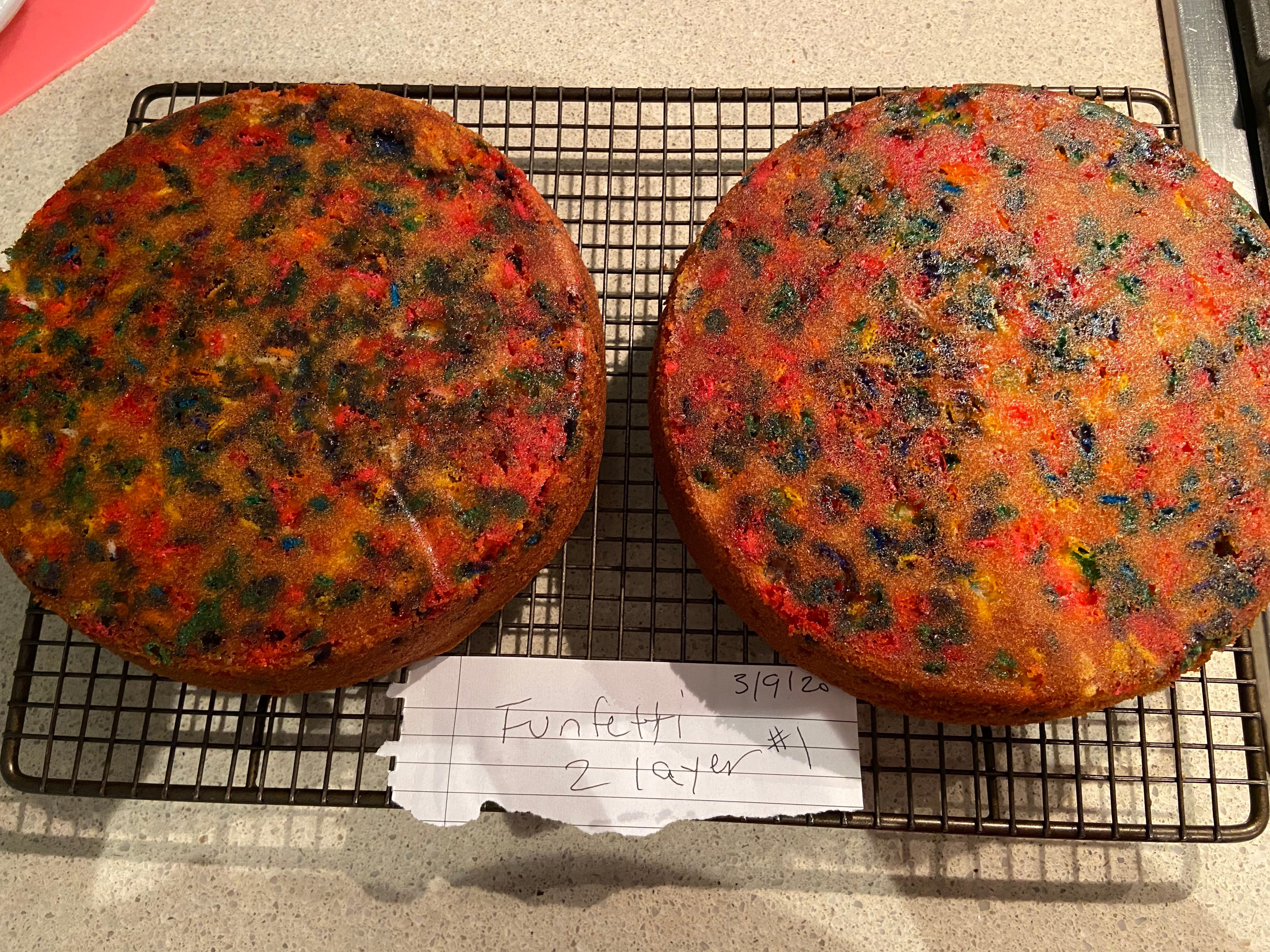 - Knock out bubbles: Bang each cake pan on the counter 3 times to knock out big bubbles (Note 10 for why)