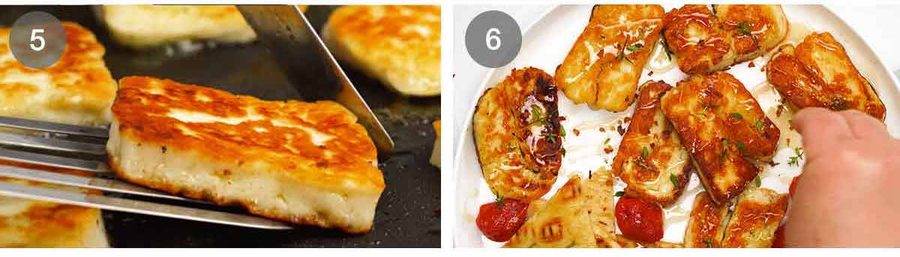 Turns out, wow, the authenticity of the origin matters! Authentic halloumi made in Cyprus is superior, delivering golden surfaces and soft gooey insides. Lower quality halloumi doesn’t pan fry as well, the insides never go soft, they stay rubbery, and they typically don’t hold their shape as well when fried (they split into a “V” or into 2 pieces, and the edges are much more jagged than what you see in my photos).