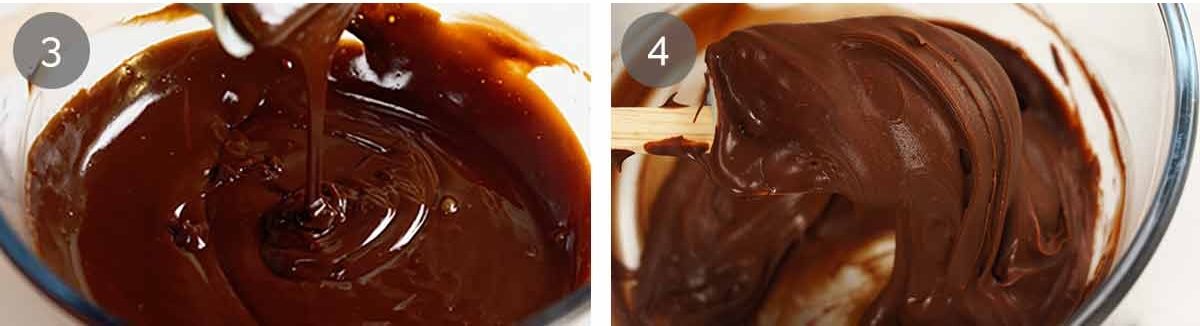 Mix with a rubber spatula until the cream and chocolate are combined to make a runny, shiny molten chocolate mixture. It will take about a minute as cream and chocolate are not natural friends, however, they will combine.