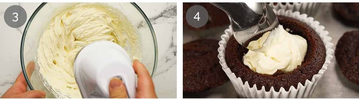 - Whipped cream – Put the cream cheese, vanilla and sugar in a bowl. Beat with an electric beater on high for 1 minute until soft and creamy. Add cream and peat until firm peaks form. (If using stand mixer, use whisk attachment).