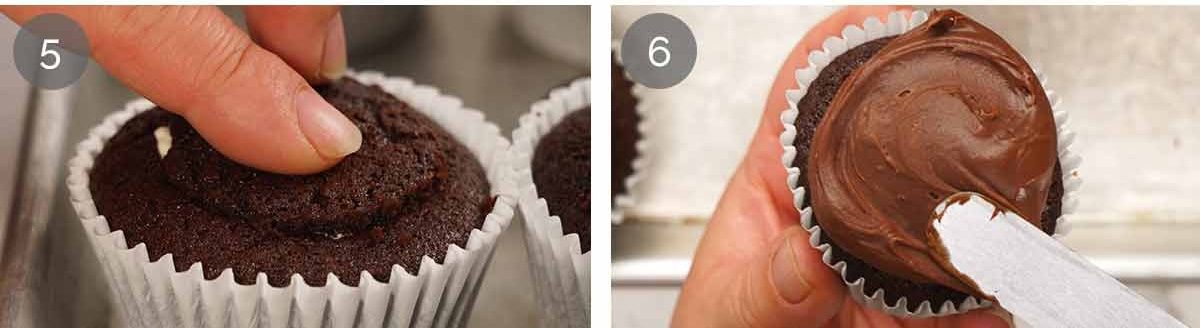 - Fill – Use a teaspoon to fill the cavity with cream, then cover with the lid, pressing in so it sits flush with the cupcake surface. Fill as much as you can without making cream ooze out when you put the lid on!