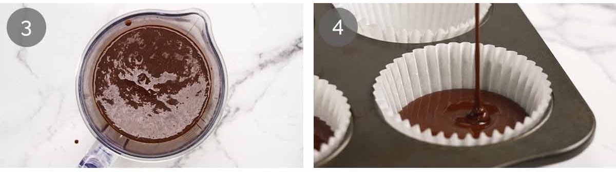 - Fill – Transfer mixture into a pouring jug (scrape out all batter). Fill cupcake liners halfway (no more – else cupcakes will overflow/sink).